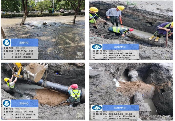 7月6日上午10點20分,客服人員接到群眾的熱線電話,告知清河路清河庭院附近路面大量跑水,運維中心搶修人員接到消息迅速前往,十五分鐘到達現(xiàn)場,通過專業(yè)技能和判斷,確定為DN400主管道爆破,測漏人員立即協(xié)助精準定位漏點,盡量減少開挖面,為搶修爭取時間,該管道會直接影響周邊黃龍五隊、清河庭院、東方小區(qū)、楚苑小區(qū)、雙橋家具大市場等小區(qū)和企業(yè)大面積水小或停水。酷暑難耐,為盡快解決群眾用水問題,維修人員在35°高溫下連續(xù)奮戰(zhàn)8小時,于當晚7點30分恢復正常供水,及時避免了周邊居民下班后正常生活用水的問題。